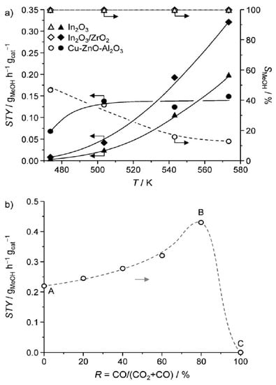 Martin et al. [79] compared the performance of pure In2O3, In2O3 supported on monoclinic ZrO2 (In2O3/m-ZrO2) and Cu/ZnO/Al2O3. 100% methanol selectivity was achieved under industrial conditions (T = 473–573 K, P = 5.0 MPa, GHSV = 16,000 h−1) over the pure In2O3 (Figure 6). The STY of methanol varies with reaction temperature as well as the CO concentration in the feed (keeping H2/CO2 = 4:1) (Figure 6), which was ascribed to the evolution of oxygen vacancies. By comparison, the In2O3 supported on monoclinic ZrO2 significantly improves the yields of methanol because of the promoted formation of oxygen vacancies, the better dispersion of In2O3, the resistance against sintering, and possibly the modulation of the In2O3 activities by a catalyst–support interactions. In addition, the supported In2O3 showed excellent stability over 1000 h under reaction conditions. For both In2O3 and In2O3/ZrO2, the oxygen vacancies were emphasized to play a key role in the adsorption and hydrogenation of CO2 molecules.