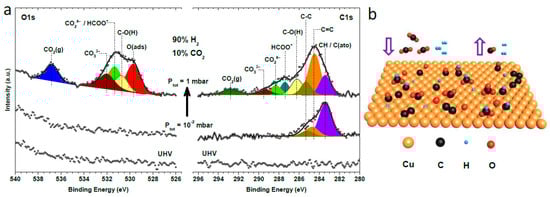 In numerous cases, the phase and microstructure are varied dynamically with the ambient environment, such as pressure, temperature, proportion, duration, etc., making the determination of the active site unconvincing. In such a situation, in situ or operando spectroscopic investigation may tell some more detailed information [212,213]. Ren et al. [214] provided direct spectroscopic evidence for the microscopic process of CO2 hydrogenation to CH3OH on Cu(111) surface at room temperature by near ambient pressure X-ray photoelectron spectroscopy (NAP-XPS), ultraviolet photoelectron spectroscopy (UPS), and low energy electron diffraction (LEED). They found that CO2 dissociates on Cu(111) surface to form atomic oxygen, and hence Cu-O species under CO2 + H2 atmosphere, which consequently promote CO2 hydrogenation to CH3OH through formate pathways, as shown in Figure 8.