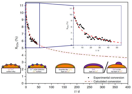 Long-term methanol synthesis over the industrial Cu/ZnO/Al2O3 catalyst at 210 °C and 60 bar. Recorded degrees of conversion (black points) under differential controlled conditions. The dashed red curve describes the intra and extrapolation of the experimental data, which were calculated with the MATLAB® software according to the studies of Fichtl et al. [229]. Illustrations from left to right: Cu0–Zn0 surface alloy according to Nakamura et al. [230]. Znδ+ species at the defective Cu0 surface according to Behrens et al. [98], graphitic-like ZnOx layer on Cu0 according to Lunkenbein et al. [126]. ZnO layer on Cu0 according to Lunkenbein et al. [228] as well as Fichtl et al. [229] and ZnO on the top layer of Cu0 according to Kattel et al. [103]. Reprinted with permission from ref. [125]. Copyright 2020 Springer.