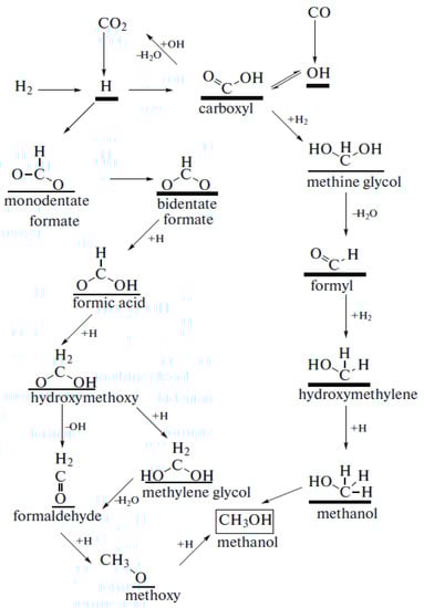 Figure 10 presents the proposed reaction pathways for methanol synthesis over Cu-based catalysts. CO2 is hydrogenated through two competing pathways via either formate or carboxyl intermediates [255]. CO was considered as starting material as well since methanol can be synthesized via CO intermediate. The dissociation of H2 was proposed to be the initial stage of the reaction, and then CO2 reacts with preadsorbed H, where the preadsorbed H indeed enhances the binding energy of CO2 on Cu and improves the probability for further elemental steps.