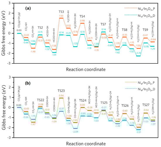 On Ni/In2O3 catalyst, a typical reaction pathway via formate pathway and RWGS pathway is shown in Figure 11 [257]. For both Ni4/In2O3_P and Ni4/In2O3_P surfaces, the RWGS pathway is the preferable route. The introduction of oxygen vacancies significantly reduces the activation barrier. Hydrogen molecules dissociate over Ni species and then spill over to the interfacial sites for further reaction.
