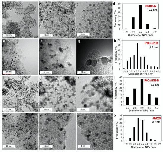 TEM of the samples: Pt/KB-N (a–c), PtCu/KB (e–g), PtCu/KB-N (i–k), JM20 (m–o), and NP size distribution histograms for the corresponding materials (d,h,l,p).