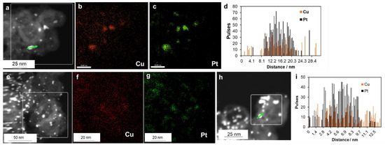 Figure 3 shows the results of surface elemental mapping for the bimetallic de-alloyed PtCu/KB and PtCu/KB-N materials, which confirmed the coincidence of the copper and platinum atoms’ location in the samples (Figure 3b,c,f,g). This means that the NPs formed in both samples were indeed two-component ones. EDX line scanning of the PtCu NP composition also confirmed the presence of two components in the nanoparticles (Figure 3a,d,h,i).