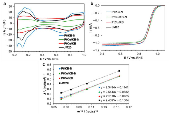 CVs of samples activated in the potential range of 0.04–1.00 (a). Linear voltammograms of oxygen electroreduction on the studied catalysts at a disk rotation speed of 1600 rpm (b). The 1 j−1 dependence of ω−1/2 at a potential of 0.90 V (c); 0.1 M HClO4.