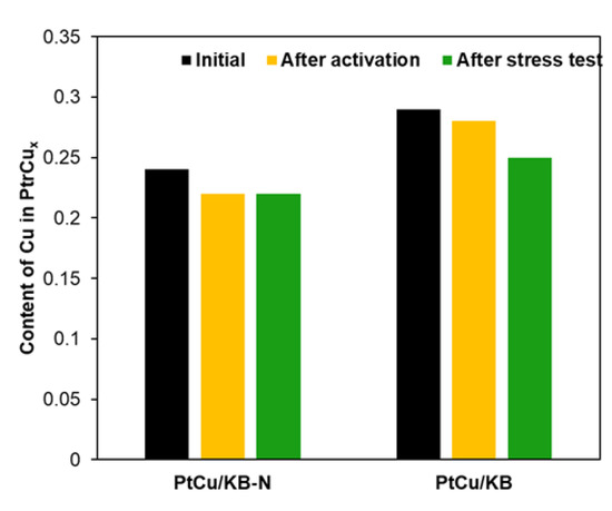 It was interesting to follow the changes in the bimetallic catalysts’ compositions at different stages of their evolution. For this purpose, the previous analysis of the bimetallic catalysts’ compositions in the “as-prepared” state was supplemented with the determination of their composition after the electrochemical activation stage, as well as after stress testing. It turned out that the PtCu/KB-N material had the highest stability: its composition did not change after the stress test (Figure 6).