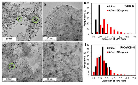 TEM of the Pt/KB-N (a,b) and PtCu/KB (d,e) samples after the stress test. Size distribution histograms of the corresponding materials before and after the stress test (c,f).