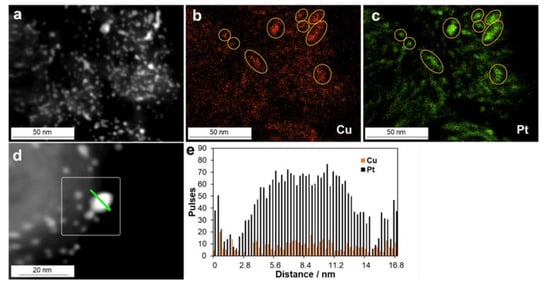The elemental mapping of the PtCu/KB-N catalyst’s surface after the stress test, as well as the EDX line scanning of the individual NP composition, confirmed: (i) the retention of copper atoms in the catalyst and (ii) the uniform localization of Cu and Pt atoms in the NPs (Figure 8).