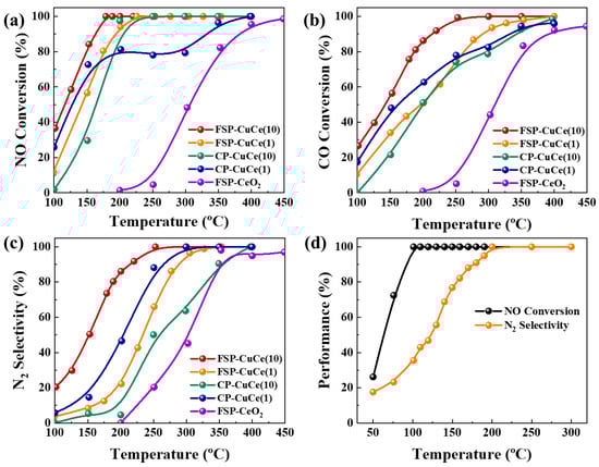 NO, as one of the main pollutants in the emission, is expected to be selectively reduced to N2 instead of the by-product N2O. The catalytic property of Cu-Ce oxide catalysts with different Cu contents (1 wt % and 10 wt %) synthesized by FSP and CP for NO reduction was explored at 100–400 °C, as observed in Figure 1a–c. NO conversion, CO conversion and N2 selectivity increased with reaction temperature for all of the tested catalysts, but they exhibited distinguished activity at low temperatures. For the CeO2 sample, the NO cannot be completely activated and reduced until 450 °C due to the absence of active metals, although the consumed NO can be converted into N2 at 350 °C with the assistance of oxygen vacancies in CeO2 lattice. When adding a small amount of Cu (1 wt %), the NO reduction activity was improved, and the 100% conversion temperature was decreased to 220 °C. It further decreased to a temperature as low as 175 °C with increasing Cu content to 10 wt %. The light-off temperature (T50) dropped down to almost 160 °C and 180 °C after adding 1 wt % and 10 wt % Cu in CeO2 via the FSP method, respectively. The FSP-CuCe with high Cu content (10%) exhibited the best activity, especially for N2 selectivity, while those synthesized by the CP method were completely different. The performance of CP-CuCe with low Cu content was more active than the one with high Cu content at low temperature, but the order was reversed above 200 °C, because the complete conversion of NO and CO cannot be obtained until 400 °C for the former. Although the NO was fully eliminated at about 200 °C over the CP-CuCe(10) sample, it can only be partially reduced into N2O, resulting in the N2 selectivity being below 5% at the same temperature. As shown in Figure 1d, the activity of FSP-CeCu(10) can be further improved in the mixture of 2% CO and 1% NO atmosphere, where NO conversion can reach 100% at 100 °C. Afterward, N2 selectivity gradually increased until 200 °C, indicating that N2O can be completely suppressed at such a low temperature. The catalytic performance of FSP-CuCe(10) has advantages in the reported Cu-based catalysts for the NO + CO reaction. For example, a Cu-Ni catalyst completely converted NO to N2 at above 350 °C [38]. The temperature was decreased to 275 °C over Cu-Mn [39] and 250 °C over Cu-Ce [40] catalysts. The catalyst was further optimized by using CeO2-Fe2O3 as the support, and 90% NO conversion was achieved at 200 °C [11]. The activity of FSP-CuCe(10) was comparable to the 1%Pd/Fe-CeO2 catalyst recently reported [26], indicating that the FSP-made CuCe catalyst in this work exhibits potential in the substitution of noble metal utilization in the elimination of NOx (NO and N2O) pollutants in an extremely low temperature range.
