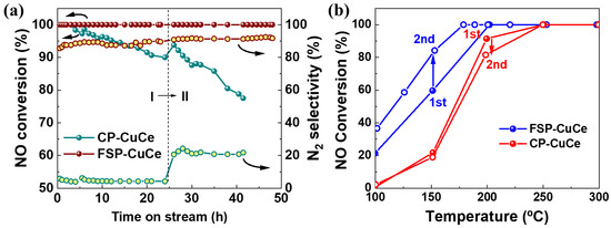 Generally, Cu-based catalyst was famous for its high activity but suffered from poor stability. During the stability test at different conditions in Figure 2a, the CP-CuCe(10) catalyst was severely deactivated, with the NO conversion decreased from 100% to 77% in 40 h, while the catalytic performance of FSP-CuCe(10) kept constant even in the condition of high GHSV. Meanwhile, the N2 selectivity slightly increased from 85% to 92%, which was much higher than that of the CP-CuCe(10) catalyst. This indicated that the amount of Cu active sites for NO dissociation decreased probably due to the aggregation of Cu particles. Usually, the CuCe catalysts were active without reduction before NO + CO reaction. For fresh FSP-CuCe(10), the activity was high without any pretreatment in the first-round test. Interestingly, NO conversion in the second-round test was enhanced compared to the first one, as shown in Figure 2b, indicating that special Cu species were formed and can be activated in the reaction conditions. On the contrary, slight deactivation was observed over the CP-CuCe catalyst.