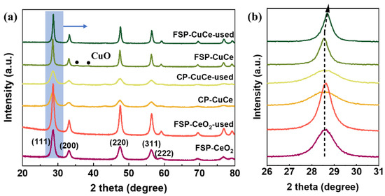 Lattice structure evaluation: (a) XRD patterns of fresh and used samples, including FSP-CeO2, FSP-CuCe(10) and CP-CuCe(10) catalysts; (b) the magnification of marked area.