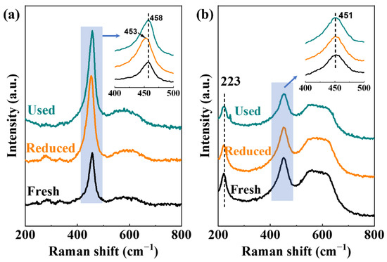 Further insight into the incorporation of Cu ions into the CeO2 lattice can be achieved by Raman spectroscopy. In Figure 5, the strong peak that appeared at around 463 cm−1 for all tested catalysts can be assigned to the F2g mode of the cubic fluorite CeO2 structure. The downshift of the F2g Raman peak is known to be related to the concentration of oxygen vacancy. The redshift of the F2g mode band for the CP-CuCe sample from 463 to 451 cm−1 was larger than that of FSP-CuCe from 463 to 458 cm−1, indicating that the amount of Cu incorporation in the CeO2 lattice, accompanied by the generation of oxygen vacancies for charge balance [45], was greater for the former than the latter. Moreover, the bands at 223 and 570 cm−1, which are also ascribed to the evolution of oxygen vacancies, showed the same trend. After reduction at 200 °C by CO, the F2g mode band of FSP-CuCe further shifted to 453 cm−1 and then turned back to 458 cm−1 after reaction, while changes were observed in the same process for CP-CuCe. This demonstrated that the surface oxygen was easier reduced and oxidized in the different atmospheres for FSP-CuCe, exhibiting higher redox capability in the aspect of mobile oxygen. It appears that the CP-CuCe catalyst could create more surface oxygen vacancies than FSP-CuCe in the fresh sample state; however, more oxygen vacancies will be formed in the reduction or reaction atmosphere for the latter, as discovered in the following sections.