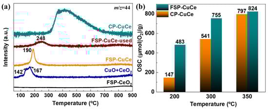Reduction behavior of Cu and Ce species. (a) CO2 generation (m/z = 44) profiles during CO-TPR of FSP-CeO2, the physical mixture of CuO and CeO2 powders (CuO + CeO2), FSP-CuCe, used FSP-CuCe and CP-CuCe. (b) Oxygen storage capability (OSC) values for FSP-CuCe and CP-CuCe catalysts evaluated at different temperatures.