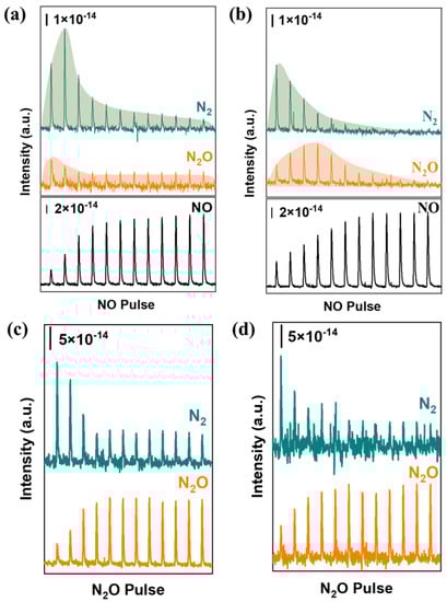 Generally, NO reduction by CO is a two-step reaction: CO + 2NO → N2O + CO2 and CO + N2O → N2 + CO2 [49], where N2O is the main by-product of incomplete NO reduction, especially at low temperatures (below 300 °C) [50]. Therefore, it is essential to control the generation of active O from NO dissociation and the reduction of lattice oxygen by CO, requiring a high regeneration rate of oxygen vacancies to promptly remove active O. NO pulse chemisorption was conducted to evaluate the rate of NO dissociation and oxygen transfer by monitoring the products, as shown in Figure 7a,b. N2 and N2O were the main products when introducing NO for all tested samples. Total consumption of NO for FSP-CuCe and CP-CuCe were 320 and 259 μmol[NO]/g, respectively. From the residue NO signal, it can be found that the FSP-CuCe sample could convert more NO in one pulse at the beginning with N2 as the main product due to the abundant oxygen vacancies. Then, the rate of NO consumption decreased to a low level and kept constant according to the observation of products in the last pulse. It is worth noting that the generation of by-product N2O was low in all pulses, revealing that the rate of NO dissociation decreased with the decrement in oxygen vacancies. On the contrary, the signal of N2 decreased and N2O became the main product with oxygen vacancies consumption in the CP-CuCe sample. The NO dissociation rate was still high with the lack of oxygen vacancies, leading to a large amount of N2O emission instead of N2. This implied that the appropriate NO dissociation and quick oxygen vacancies generation were essential for the redox cycle, preventing the recombination of redundant active O and N into N2O. To further investigate the reduction behavior of N2O, N2O pulse chemisorption was also conducted at 200 °C, as shown in Figure 7c,d. The rate of N2O reduction into N2 was quicker on FSP-CuCe than on CP-CuCe. The total consumption of N2O was 160 and 95 μmol[N2O]/g for FSP and CP catalysts, respectively, demonstrating that the former was more active in both NO and N2O conversion than the latter.