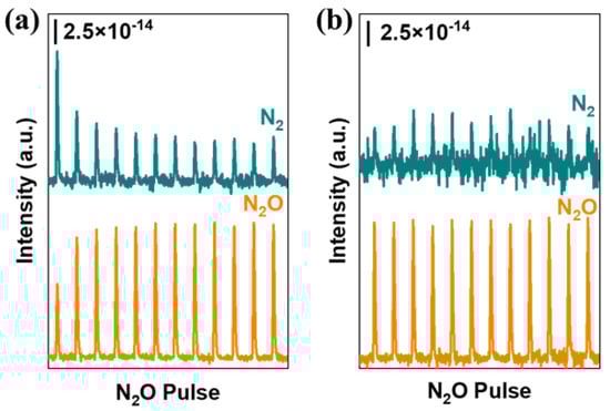 Monitoring of N2O consumption and N2 formation during N2O pulses by mass spectrometer at 50 °C over (a) FSP-CuCe and (b) CP-CuCe catalysts. The samples were firstly reduced by CO at 200 °C, then 5%N2O/He was pulsed into the reactor 12 times.