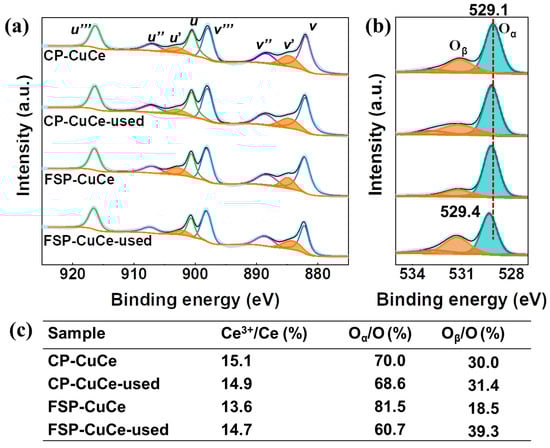 XPS was conducted to study the chemical state of the elements and oxygen species via Ce 3d and O 1s spectra. As shown from Ce 3d spectra in Figure 9a, six peaks (v, v″ and v′′′ of Ce 3d5/2 as well as u, u″ and u′′′ of Ce 3d3/2) can be assigned to Ce4+ species, while v′ and u′ features (marked with orange) belonged to Ce3+ species [51]. The reduction degree of ceria can be estimated by the Ce3+ content in total Ce [52]. The XPS spectra in the O 1s region can be deconvoluted into two peaks, as shown in Figure 9b. The main peak Oα at 529.1–529.4 eV is assigned to the characteristic lattice oxygen bonding to the metal cations (dyed in green), while Oβ with higher binding energy at 531.1–531.4 eV represented the surface chemisorbed oxygen such as O2−, O− or adsorbed oxygen species from hydroxyl or water species on the surface (dyed in orange) [53,54]. From the summary of the fitting results in Figure 9c, the percentages of reduced cerium ions (Ce3+) for the studied samples were more or less the same for both FSP- and CP-made CuCe samples, and they can remain stable during redox cycles in reaction. Although the Cu species were different produced by FSP and CP methods, the enhancement of surface Ce3+ species was similar, indicating that the Cu particles on the surface could also create Ce3+ species through the metal–support interface. It has been reported that the formation of surface chemisorbed oxygen Oβ was essential for redox reactions by enhancing oxygen mobility of the catalysts [55]. The active Oβ species can remain stable during reaction in the CP-CuCe catalyst, while they were greatly enhanced from 18.5% to 39.3% during reaction for FSP-CuCe. Therefore, it is expected that the enhanced oxygen mobility of the FSP-CuCe catalyst results in high activity for NO + CO reaction, especially in the second-round test.