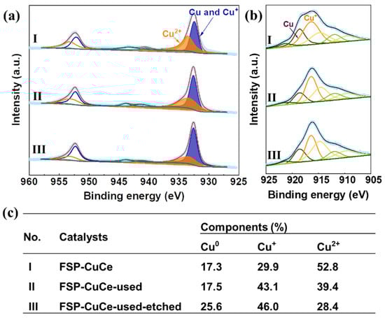 The XPS spectra of Cu 2p are presented in Figure 10a for the fresh and used FSP-CuCe samples, as well as the used one with Ar+ ion etching treatment to eliminate the effect of oxidation in the air on the valence state of Cu species. Usually, Cu2+ has an observable collection of satellite features between 939.0 and 945.8 eV. The presence of reduced Cu species can be estimated by the ratio between the intensity of the shake-up satellite peak and the main Cu 2p3/2 peak (0.55) [56]. For all measured samples, the peaks for Cu 2p3/2 (933.7 eV) were much larger than the satellite peaks, indicating that they contained both Cu2+ and reduced Cu species (Cu0 and Cu+). The fitting for Cu 2p was performed following the split spin–orbit rules with a distance of 19.75 eV and an intensity ratio of 0.508. The one that belonged to Cu2+ was marked as orange with a center at about 933.5 eV, while the reduced Cu species were in blue at about 932.5 eV. The distinction of Cu0 and Cu+ species was further performed by Cu LMM Auger peaks at 918.6 and 916.8 eV (Figure 10b). The content of different Cu species is summarized in Figure 10c. Almost half of Cu species were in a +2 oxidation state accompanied by 30% Cu+ in the fresh FSP-CuCe sample. Moreover, a significant reduction of Cu2+ to Cu+ was observed during the reaction since the Cu+ was increased to 43.1% after the reaction. From the comparison to the etched sample, Cu+ species were stable even when exposed to the air, while Cu0 was more readily oxidized to CuO. It was reported that the existence of Cu+ can be attributed to its bigger electronegativity due to the shift of electron conversion redox equilibrium from Ce3+ to Cu+ [57]. Then, the formation of low-valent state Cu species can effectively promote the reduction of Ce4+ species to Ce3+ species. This redox process of Ce4+/Ce3+ at the interfacial position could also be connected with the formation of the defect structure with oxygen vacancies, resulting in the enhancement of oxygen mobility.