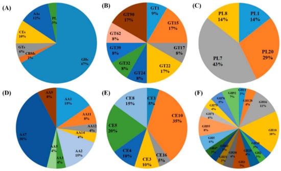 CAZymes identified in the secretome of T. asperellum ND-1. (A) Summary of the six CAZyme categories: auxiliary activities (AAs), carbohydrate- binding modules (CBMs), polysaccharide lyases (PLs), glycoside hydrolases (GHs), glycosyl transferases (GTs), and carbohydrate esterases (CEs). (B) Distinct summaries of the CAZyme GTs. (C) Distinct summaries of the CAZyme PLs. (D) Distinct summaries of the CAZyme AAs. (E) Distinct summaries of the CAZyme CEs. (F) Distinct summaries of the CAZyme GHs.