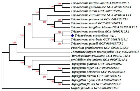 Whole-genome phylogenetic analysis of T. asperellum ND-1 sequences. The tree of selected genome sequences was constructed by using the neighbor-joining (NJ) method with the Poisson model, as implemented in Mega software 7.0. T. asperellum ND-1 was labeled with diamonds.