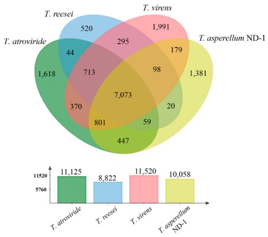 Comparative analysis of orthologous genes between different Trichoderma species. The annotated proteome of T. asperellum ND-1 was further compared with the other three biological species, T. reesei QM6a, T. virens Gv-298, and T. atroviride IMI 206040, by using orthoMCL [65]. Among the four Trichoderma species, a total of 7073 common clusters were identified (Figure 5). The common clusters accounted for 60–80% of the four fungal proteomes, respectively, which indicated that the vast majority of the genes were conserved in the Trichoderma group. However, T. asperellum ND-1, T. atroviride IMI 206040, and T. virens Gv-298 contained about 1381, 1618, and 1991 species-specific clusters, respectively, but the T. reesei QM6a had only 520 unique clusters (Figure 5), consistent with a previous study, showing that T. reesei contained fewer exclusive orthologous genes than other sequenced fungus [43,44]. Moreover, T. virens and T. atroviride are probably the most popular investigated biocontrol agents utilized in various agriculture fields [60]. In this study, we found that T. asperellum ND-1, T. atroviride IMI 206040, and T. virens Gv-298 shared 801 orthologues that were not detected in T. reesei QM6a (Figure 5), which may be partial factors that resulted in a T. asperellum ND-1 biological control function [63,64]. In addition, we identified that 7250 orthologous genes were present between T. asperellum ND-1 and T. reesei QM6a (Figure 5), indicating that T. asperellum ND-1 may have strong biomass degradation ability [38,41]. A number of 7889, 8179, and 8957 common clusters were also predicted between Trichoderma species (Figure 5) when comparing T. reesei QM6a vs. T. atroviride IMI 206040, T. reesei QM6a vs. T. virens Gv-298, and T. atroviride IMI 206040 vs. T. virens Gv-298, respectively.
