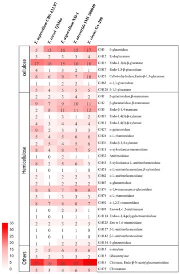 Heat map showing the distribution of glycoside hydrolases (GHs) in the genomes of T. atroviride IMI 206040, T. virens Gv-298, T. reesei QM6a, T. asperellum ND-1, and T. asperellum CBS 433.97. CAZymes families are grouped according to their activities in major components of plant cell walls.