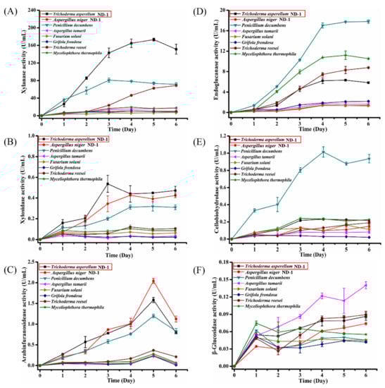 Among hemicellulases, xylanase activity in T. asperellum ND-1 extract improved sharply over time and obtained the highest level of 173.25 ± 3.14 U/mL after 5 days of cultivation (Figure 7A). Xylanases produced by T. asperellum ND-1 were identified to efficiently hydrolyze xylan into major product xylobiose [11]. For P. decumbens, the corresponding activity increased slowly to reach the maximum value (80.83 ± 4.55 U/mL) on day 3 (Figure 7A). Xylanase activity produced by T. reesei increased gradually until the end of the cultivation and a maximum of 68.84 ± 2.98 U/mL was achieved on day 6, while it was much lower in G. frondosa, F. solani, A. tamarii, A. niger ND-1, and M. thermophila extract (Figure 7A). β-xylosidase activity of T. asperellum ND-1 increased over time, and a peak (0.54 ± 0.08 U/mL) displayed on day 3 (Figure 7B). For A. niger ND-1 and P. decumbens, the activity was up to a maximum (0.43 ± 0.003 U/mL and 0.31 ± 0.02 U/mL, respectively) after 4 days (Figure 7B) and then remained relative stable. In contrast, the enzyme activity of T. reesei, M. thermophila, and F. solani fluctuated at a low level between 0.046 ± 0.003 and 0.12 ± 0.02 U/mL during the cultivation time (Figure 7B). A minimal β-xylosidase activity was observed in the G. frondosa and A. tamarii extract (Figure 7B). In addition, reports reveal that side-chain-degrading enzymes play a crucial role in the degradation of biomass [17]. α-L-arabinofuranosidase activities were found and showed the maximum level on day 5 in all selected fungi. In T. asperellum ND-1, the enzyme activity reached a maximum value of 1.58 ± 0.06 U/mL (Figure 7C), with a 5.5-fold, 4-fold, and 1.3-fold higher level, respectively, compared with that of M. thermophila, T. reesei, and P. decumbens. These results, taken together, reveal that T. asperellum ND-1 produced various hemicellulases with significantly higher activities, which can be utilized in various fields, particularly in the production of valuable biomolecules (prebiotics, xylooligosaccharides).