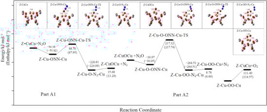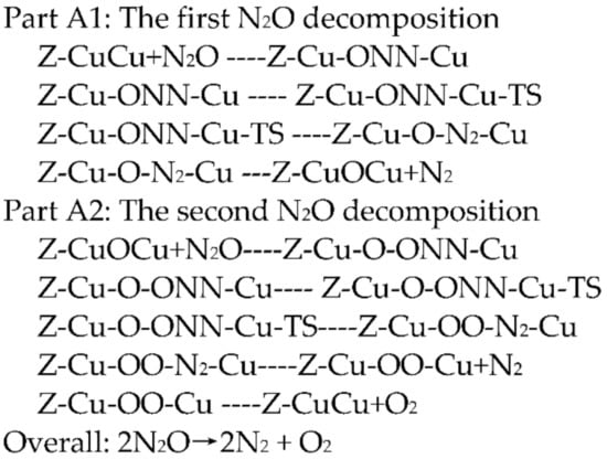 As shown in Scheme 1, the decomposition of the first N2O molecule include four elementary steps. The first N2O molecule is adsorbed between two Cu atoms, forming an O-bridge with two Cu atoms. The distance between O1 atom and Cu1 atom is 2.11 Å, and the distance between O1 and Cu2 is 2.24 Å. The activation energy of the transition state Z-Cu-ONN-Cu-TS is 88.70 kJ mol−1, and the imaginary frequency is −680.84 icm−1. The distance between the O1 and the two Cu atoms in the transition state is reduced. The formation of the intermediate product Z-Cu-O-N2-Cu releases a lot of energy. The adsorbed N2 desorbs from the active site and forms gaseous N2, and the intermediate product Z-CuOCu produced at the same time has a stable oxygen bridge structure, a process which only needs to absorb a small amount of energy (∆E = 15.68 kJ mol−1). The triplet state of the Z-CuOCu structure is the most stable, which is consistent with the results of previous studies [38,40].
