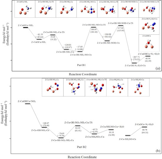 The energy profile of the reaction steps of NOX-NH3-SCR over the [Cu-O-Cu]2+ active site: (a) the reaction of NO and NH3, (b) the reaction of NO2 and NH3. (All the framework atoms are omitted.)