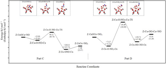 Since NO is added into the N2O decomposition system, the NO molecular adsorbs on the active site by the N-terminal (shown in Figure 3) and catches the O atom of the catalytic site to form the transition state (Z-Cu-O-NO-Cu-TS). The transition state energy barrier is 64.12 kJ mol−1, and the virtual frequency is −468.28 icm−1. Subsequently, NO reacts with the O atom to generate NO2, and then the NO2 is desorbed from the active site after absorbing 17.68 kJ·mol−1 energy. It can be seen from Part C of Figure 3 that the NO activation process is the rate-limiting step of the NO-assisted active center transformation process, and the energy barrier is much smaller than that of the decomposition process of the N2O molecule adsorbing on the same active site.