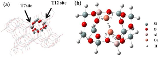 (a) Location of the T7 and T12 positions in the sinusoidal channel of the ZSM-5 catalyst; (b) optimized binuclear Cu-ZSM-5 cluster.