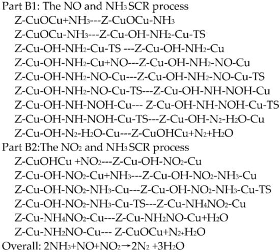 There are two types of SCR mechanisms: the standard SCR and the fast SCR. In the fast SCR mechanism, NO2 directly participates in the reduction process, avoiding the higher energy barrier of the NO oxidation process in the standard SCR mechanism, and therefore, exhibits a higher reaction rate. Colombo et al. [24] tested the activity of a series of NO/NO2 and NH3 reactions with different component ratios. They proved that when NO and NO2 participate in the reaction in equal amounts (NO2/NOx = 0.5), the SCR reaction shows the best deNOx performance, which is attributed to the fast SCR reaction mechanism. In the present work, after the first N2O decomposition process, a stable extra-frame [Cu-O-Cu]2+ structure generates. We simulated the reaction mechanism of NOX-NH3-fast SCR over the [Cu-O-Cu]2+ site by the DFT method. To simplify the description of the entire reaction process, the fast SCR reaction mechanism is selected for discussion. Colombo et al. [24] pointed out that the interaction between NH3 and the catalyst active site is very important in the SCR reaction because the deNOx performance and the kinetics of the SCR converter are controlled by the reactivity of adsorbed NH3. Through many experimental results and simulation research data, Li et al. [23,46]. and Denis et al. [56] concluded that NH3 in all reactants will first be adsorbed on the active site. This conclusion is reconfirmed by our current work. After the NH3 is adsorbed on the active site, the dissociation of NH3 to NH2 occurs first, then the NH2 reacts with the adsorbed NO to form a NH2NO cluster. The decomposition of the NH2NO cluster into H2O and N2 (shown in Figure 2a, Part B1) has a relatively high activation energy. The same phenomenon was also confirmed by Mao et al. [57] while studying the NOX-NH3-SCR reaction on Cu-SAPO-34. They noted that an unstable, four-membered ring is formed during the intramolecular proton transfer, resulting in a strong steric hindrance. The mechanism of NO2-NH3-SCR is controversial in the literature. Based on transient reactivity experiments, Grossale et al. [58] pointed out that during the NO2-SCR reaction, nitrates are formed as an important intermediate through the disproportionation of NO2, then selectively reduced by NH3. Iwasaki and Shinjoh [59] mentioned that a NH3 reacts with NO2 to form N2O first, then the intermediate product N2O reacts with another NH3, and the sum of these two steps come to the stoichiometry of the NO2-SCR. Colombo et al. [24] via a kinetic study and direct experimental evidence, proved that if the two-step mechanism is followed (NO2 is reduced to N2O first), it is kinetically limited by the N2O reduction process and therefore, damaging to the overall activity, which is inconsistent with their experimental evidence. This proves that the introduction of an independent NO2-SCR reaction is feasible. Therefore, the NO2-NH3-SCR mechanism and simulation data listed can be a reference provided for readers. The rate of the entire NO2-NH3-SCR process is limited by the step that NH3 decomposes to form NH2.