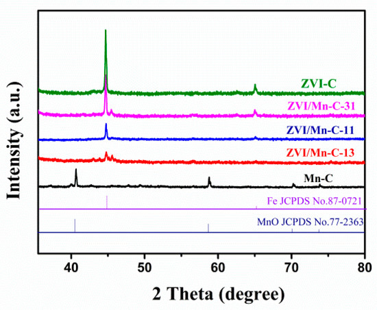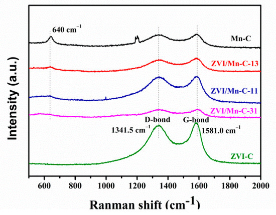 The XRD patterns of ZVI/Mn-C samples are shown in Figure 2. The Mn-C sample displayed diffraction peaks at 40.5°, 58.7°, 70.2° and 73.8°, which were ascribed to the (200), (220), (311) and (222) crystal planes of the cubic MnO phase (JCPDS no. 772363), indicating that MnO could not be reduced to Mn metal during the carbothermic reduction. For the ZVI-C sample, diffraction peaks at 44.6° and 65.2° attributed to the (110) and (200) crystal planes of ZVI (JCPDS no. 87-0721) were detected, demonstrating that ferric iron was converted into ZVI by the carbothermic reduction. With the introduction of manganese species, the XRD peaks of ZVI became gradually weak, indicating a good dispersion of ZVI. A diffraction peak indexed to MnO could not be seen among the ZVI/Mn-C samples, which can be due to the isomorphic substitution between iron and manganese atoms just as reported in a previous paper [34]. Meanwhile, the structures of the ZVI/Mn-C composites were further investigated by their Raman spectra and the result was a shown in Figure 3. The weak peaks around 640 cm−1 were attributed to the stretching vibration of the Mn-O bond in MnO [39,40,41], proving the existence of manganese oxide in the ZVI/Mn-C composites. In addition, the strong peaks at 1341 and 1581 cm−1 were ascribed to the disordered carbon (D-band) and the ordered graphitic carbon (G-band) in the PF-derived carbon spheres, respectively. From the Raman spectra, the intensity ratios of the D and G bands of ZVI/Mn-C samples were 2.89, 2.33, 2.67, 2.60 and 1.54 for ZVI-C, ZVI/Mn-C-31, ZVI/Mn-C-11, ZVI/Mn-C-13 and Mn-C, respectively. All the ZVI/Mn-C samples were rich in disordered carbon but lacking in graphitic carbon, especially with the existence of iron.