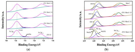 An XPS characterization was carried out to investigate the composition and element chemical state in the obtained ZVI/Mn-C samples. As seen in Figure 5a, the peak at 710.60 eV of the four iron-containing samples was assigned to Fe 2p3/2 (Fe(III)), with its satellite signal at 715.5 eV [46]. No peak belonging to ZVI was detected in the spectra. These fitting results suggested that iron species on the surface were oxidized to Fe (III) by oxygen in the air. As shown in Figure 5b, the peaks in Mn 2p spectrum were attributed to Mn (II) and Mn (III). Moreover, the presence of Mn (III) was also due to the partial oxidation by oxygen in the air. Compared to the monometallic Mn-C sample, the binding energy of Mn 2p3/2 shifted to a lower level with the incorporation of ZVI, which meant that ZVI acted as a good electron donor here. For the three bimetallic samples, the binding energy of Mn (II) 2p3/2 [47,48] shifted from 640.30 eV to 640.06 eV when the Fe/Mn ratio changed from 1:3 to 3:1. The results illustrated that the electron cloud density of the Mn species was higher with the increasing Fe/Mn ratios [49], which were consistent with the degradation results in this heterogeneous Fenton-like process.