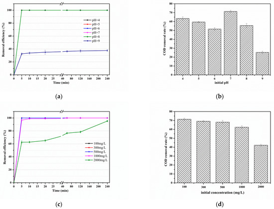 In the heterogeneous Fenton-like reaction, the operating conditions affect the degradation efficiency of organic pollutants [51,52]. Firstly, the effect of the initial pH of the solution on the phenol removal over the ZVI/Mn-C-31 catalyst is shown in Figure 7a,b. No obvious difference existed for phenol removal over the extended pH range from 4 to 8, and the phenol was completely removed in 5 min. Notably, ZVI/Mn-C-31 exhibited a superior catalytic performance at pH = 7, and the conversion of COD was nearly 70% within 240 min. However, it was observed that the removal efficiency of phenol decreased greatly at an initial pH = 9. The inactivation was due to the decomposition of H2O2 at alkaline conditions, which would seriously reduce the utilization of free radicals [52]. This illustrated that free radicals may be formed by the introduction of Mn, which enabled the ZVI/Mn-C-31 to have excellent catalytic performance in a wide pH range.