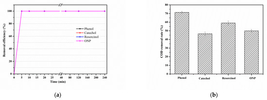 Several common aromatic pollutants, such as catechol, resorcinol and o-nitrophenol (ONP), were selected to evaluate the activity of the ZVI/Mn-C-31 catalyst under a neutral pH. The catalyst had good degradation activity for these pollutants. As shown in Figure 8, all three aromatic pollutants could be removed in 5 min, and a COD removal efficiency of 46%, 60% and 49% for catechol, resorcinol and o-nitrophenol, respectively, could be achieved, suggesting that the ZVI/Mn-C-31/H2O2 system possessed a wide usability for most common phenolic organics. The nonselective catalytic degradation process is of greater importance to practical applications in removing organic pollutants.