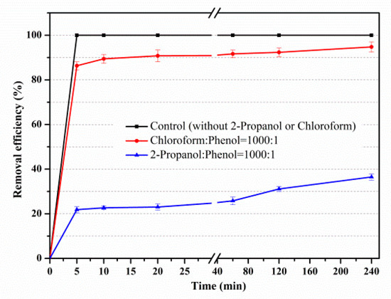 Effect of 2-propanol and chloroform on the degradation of phenol in aqueous solutions by the ZVI/Mn-C-31 Fenton-like process (conditions: [ZVI/Mn-C-31] = 2 g/L, [phenol] = 100 mg/L, [H2O2] = 0.2 mol/L, initial pH = 7).