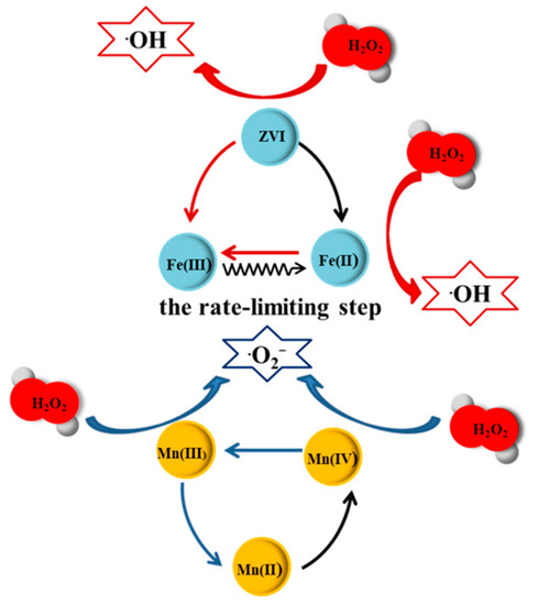 Superoxide radicals can be generated from the MnO–H2O2 system according to previous reports [35,71]. The interaction between Mn2+ and H2O2 played a key role in the organic oxidation process especially under neutral conditions (Equation (9)). Mn4+ and Mn3+ can be obtained by reduction reactions involving H2O2 and then generated ·O2− in the following reactions (Equations (10) and (11)), thereby the conversion rate of ferric iron to ferrous iron was accelerated (Equation (8)). Based on the above analysis, it can be concluded that the reaction activity can be effectively promoted by adding manganese in an appropriate amount. However, it should also be noticed that with excessive manganese, hydrogen peroxide would be consumed quickly resulting in less hydroxyl radicals (Equations (9) and (11)). Therefore, the bimetallic Fenton-like reaction greatly benefitted from a proper Fe/Mn ratio due to the synergistic effects of ZVI and MnO, which is consistent with the XPS results.