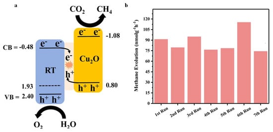 (a) Z-scheme charge transfer mechanism for reduced titania-Cu2O heterostructure. (b) Methane production rate for seven sequential tests [16]. Copyright Elsevier B.V., 2020.