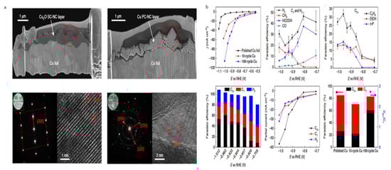(a) Graphic representation of 0D-Cu CO2R activity and (b) its catalytic activity with response to the electrocatalytic activity [71]. Copyright American Chemical Society, 2020.