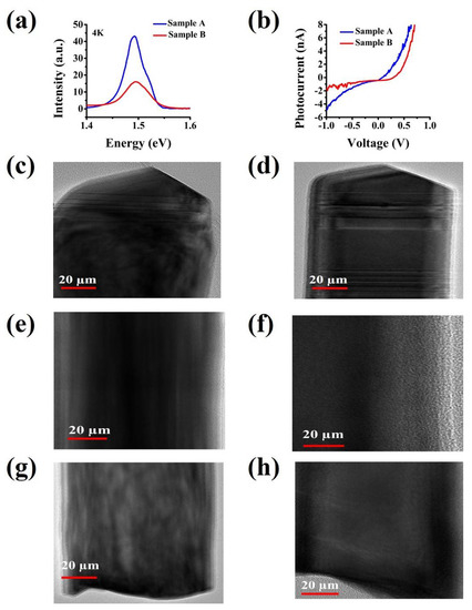 (a) Superimposed 4K PL spectra, (b) superimposed SNW I-V characteristics under illumination, (c,e,g) and (d,f,h) HRTEM images of NW top, middle, and bottom segment of Te-doped GaAs NWs with two different droplet consumption approaches.