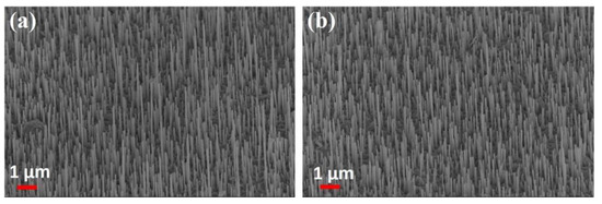 The average length and diameter of n-GaAs NWs grown were 1.75 µm and 153 nm, respectively, with no effects of annealing on axial and radial growth, NW density or morphology, as displayed in SEM images of as-grown (Figure 2a) and annealed NWs (Figure 2b).