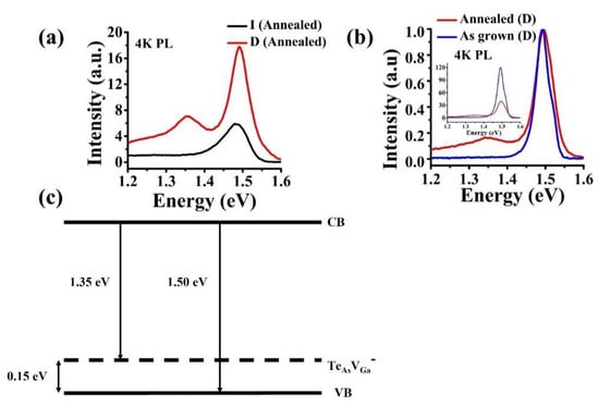 Figure 3a,b depict the 4K PL emission comparison of the annealed intrinsic (I) and annealed Te-doped (samples D) NW samples, grown under identical conditions to sample B. The value of n-type carrier concentration in the Te-doped GaAs NWs was calculated to be ~5 × 1019 cm−3 based on electrical characterization and various surface measurement techniques [27,33]. The PL emission of annealed sample D exhibited an additional lower energy peak at 1.35 eV in addition to the intrinsic bandgap peak at 1.49 eV, and PL emission was also significantly enhanced (~4×) for the as-grown doped sample. The presence of a lower energy peak 0.14 eV below the intrinsic GaAs peak in sample D is assigned to a transition of photoexcited electrons from the conduction band to an acceptor level complex (TeAsVGa−) formed in Te-doped GaAs [34] materials, as depicted in the band diagram (Figure 3c). The origin of this complex is speculated to arise from the interaction of a Ga vacancy with Te atoms occupying an As lattice site (TeAs) with post-growth annealing promoting the interaction, consistent with the observation in annealed Te-doped GaAs thin films [35]. An absence of this lower energy peak in intrinsic GaAs NWs (Figure 3a) and 4-fold 4K PL emission intensity reduction in annealed doped NWs relative to doped as-grown NWs (inset Figure 3b) suggest annealing-induced defect formation.