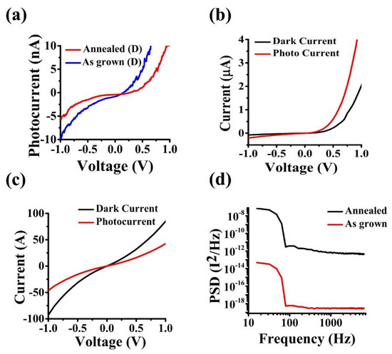 (a) SNW I-V characteristics of annealed and as-grown doped nanowires under 860 nm illumination. Ensemble NW IV characteristics of (b) as grown GaAs: Te NWs and (c) annealed GaAs: Te NWs, and (d) low-frequency noise (LFN) spectrum.