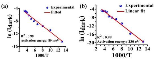 The temperature dependence of dark current was investigated to ascertain the activation energy of these traps. The temperature-dependent dark current variation of the as-grown and the annealed NWs at a forward bias of 0.2 V are depicted in Figure 5a,b, respectively. The activation energies in annealed and as grown Te-doped NWs were calculated from the slope of the Arrhenius plots as shown in Figure 5, using the following equation, assuming the presence of only one defect state: