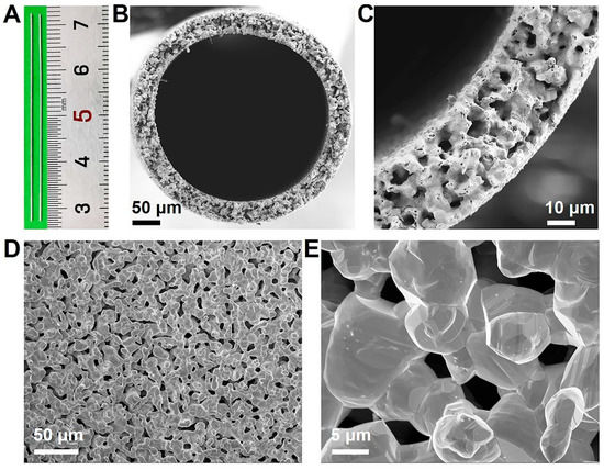 Characterization of Ag HF: (A) optical image and SEM images of (B,C) cross-sections and (D,E) outer surfaces of Ag HF.