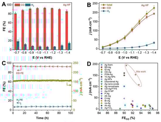As a matter of fact, although the Ag HF we reported here could efficiently and stably electroreduce CO2 to CO by virtue of abundant active sites and favorable mass transport due to its unique pore structures, the ≤300 mA∙cm−2 current densities are still limitations to affording an economically viable CO2 electrochemical conversion [26,30]. Future studies could be aimed at the optimization of hollow fiber configurations, such as tuning the surface morphology and size of Ag nanoparticles to obtain more active sites through synthesizing nanostructured [50] or oxide-derived Ag catalysts [20] to give full play to the improved favorable mass transport of the Ag HF for more efficient CO2 electroreduction for scalable applications.