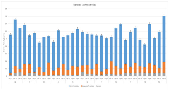 The result shows some fungi exhibit multiple peaks of ligninolytic enzyme activities. This finding is similar to previous reports on ligninolytic enzymes [21,22]. The later peak is present partly because of the release of intracellular ligninolytic enzymes from fungal autolysis to the medium [21]. The result shows that cellulolytic enzymes show a higher reading at the beginning of the experiment, followed by a decreasing trend later. This is mainly due to the formation of aromatic water-soluble products from the delignification process, which suppresses the activity of cellulolytic enzymes [23]. For the hemicellulolytic enzymes, the activity decreases on day 45 due to the depletion of resources as the hemicellulose has been broken down by xylanase [24].