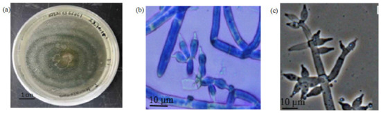 The Morphological Observation of Fungi F1. Note: (a) the morphology of the fungi culture; (b) the microscopic observation of the conidia; (c) the morphological reference of the fungi conidia [14].