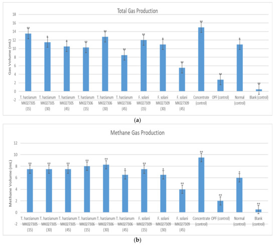 The highest methane production and the lowest methane production were shown by Trichoderma harzianum MKT027305 and Fusarium solani MK027309, respectively. Conventionally, the increase in the gas produced is associated with an increase in dry matter and a disappearance of organic matter [29]. The production of methane gas represents a loss of 2–12% in energy by the host animal [30].