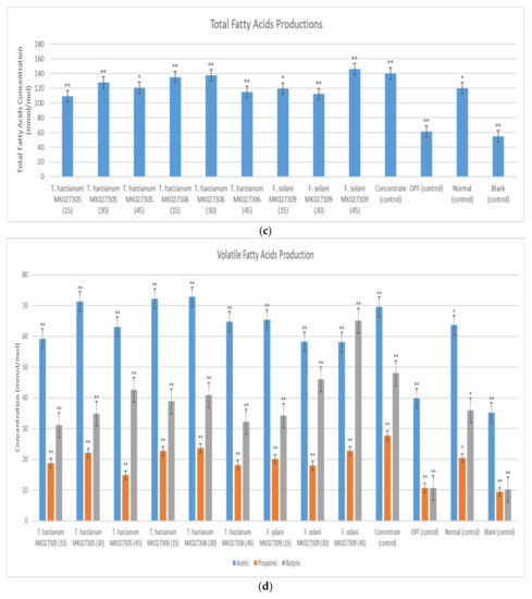 The syringe containing OPFs pretreated with the enzyme extract extracted from Fusarium solani MK027309.1 after 45 days showed the highest fatty acid production and a significant increase (p < 0.05) of 21.67% over the non-pretreated OPFs with a normal diet (Figure 9c). Consequently, the syringe also showed higher propionic acid production compared to other syringes, except for the syringe containing OPFs pretreated with enzymes extracted from Trichoderma harzianum MK027306 after 30 days of solid-state fermentation (Figure 9d). Apart from that, the syringe also exhibited the highest production of butyrate compared to the other syringes. Butyrate and propionate are produced more abundantly when the cattle are fed with easily fermentable carbohydrates. Propionate is the end product of starch and sugar, which provides most of the energy needed for live weight gain and for lactose production by the mammary. Further, propionate is more energy-efficient because most of the fatty acids are absorbed in the animal, thus producing less carbon dioxide and methane [31]. The result correlates with the enzyme activity profile of fungi Fusarium solani MK027309, which showed higher cellulose and hemicellulose activity and lower ligninolytic activity among the selected fungi. This is due to the production of glucose (the end product of cellulase), which increases the availability of fermentable sugar for the rumen microbes [32]. The low methane production of the syringe containing OPFs pretreated with enzymes extracted from Fusarium solani MK027309 after 45 days of solid-state fermentation, as exhibited in Figure 9b, can also be attributed to the increased production of propionic acid, as it may reduce the supply of hydrogen gas for methane production [29].