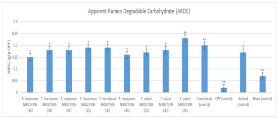 The Apparent Rumen Degradable Carbohydrate of g/g of OPFs of Each Syringe’s Content. Note: the number in the brackets indicates the solid-state fermentation period of the enzyme extract. The (**) indicates a significant difference compared to a normal diet, while the (*) indicates no significant difference.
